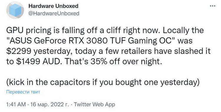 По данным YouTube-канала HardwareUnboxed, в Австралии стоимость ASUS TUF GeForce RTX 3080 всего за один день снизилась сразу на 35 %. Если ранее видеокарту можно было найти в продаже не дешевле 2299 австралийских долларов (1685 долларов США), то сегодня она предлагается за 1499 австралийских долларов ($1100).