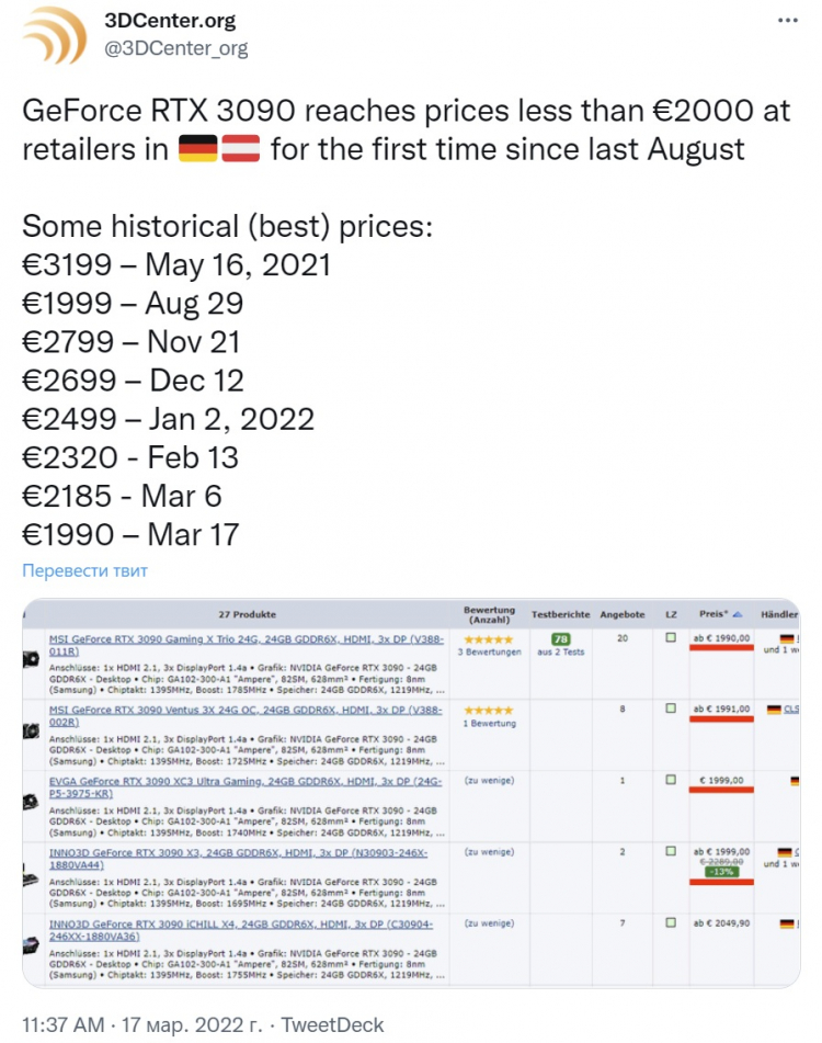 Стоимость графического ускорителя GeForce RTX 3090 опустилась ниже 2000 евро впервые за полгода. Теперь видеокарта продаётся в Европе «всего» на 20 % дороже своей рекомендованной цены, сообщает свежий отчёт 3DCenter.
