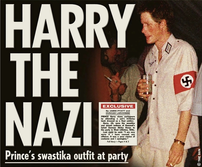 Скандал вокруг неудачного решения принца Гарри для костюмированной вечеринки разразился в 2005 году. Он появился на праздновании дня рождения олимпийского чемпиона по конному спорту Ричарда Мида в мундире немецкого офицера с нарукавной повязкой со свастикой. Представители королевского двора объяснили его поступок неудачной шуткой, а сам принц принес извинения.