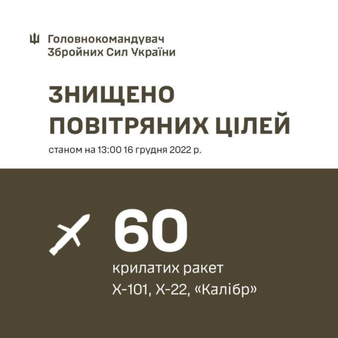 А, согласно рапорту главнокомандующего ВСУ Залужного, по состоянию на 16 декабря прошлого года, украинские вояки сбили 60 крылатых ракет Х-101, Х-22, «Калибр».