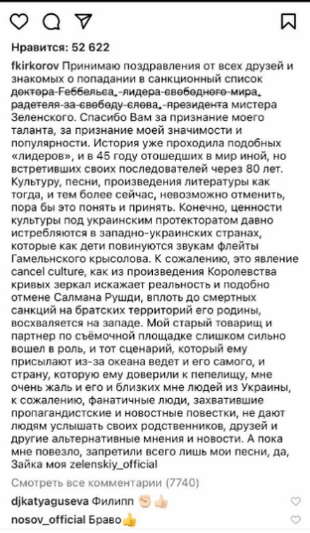 «Мой старый товарищ и партнер по съемочной площадке слишком сильно вошел в роль, и тот сценарий, который ему присылают из-за океана, ведет и его самого, и страну, которую ему доверили к пепелищу, мне очень жаль и его, и близких мне людей с Украины. К сожалению, фанатичные люди, захватившие пропагандистские и новостные повестки, не дают людям услышать своих родственников, друзей и другие альтернативные мнения и новости. А пока мне повезло, запретили всего лишь мои песни, да, Зайка моя», — написал тогда в Instagram Киркоров, подчеркнув, что «культуру, песни, произведения литературы невозможно "отменить", пора бы это понять и принять».
