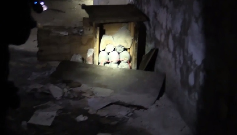 Из погреба извлечены гранаты различных модификаций с запалами в количестве трех штук; два магазина к автомату Калашникова, снаряженные 60-ю патронами калибра 5,45 мм и тротиловые шашки весом 2400 грамм. Находка уничтожена.