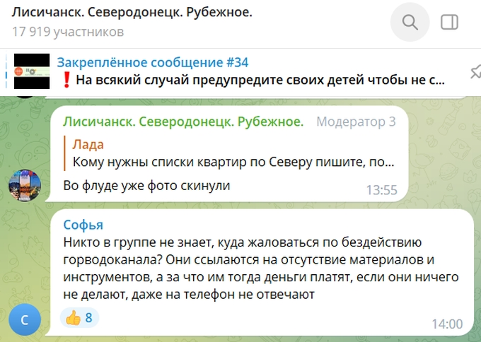 «Никто не знает, куда жаловаться на бездействие водоканала? Они жалуются на отсутствие материалов и инструментов, а за что им тогда деньги платят, раз они ничего не делают, даже на телефон не отвечают», – пишет жительница Рубежного Софья.