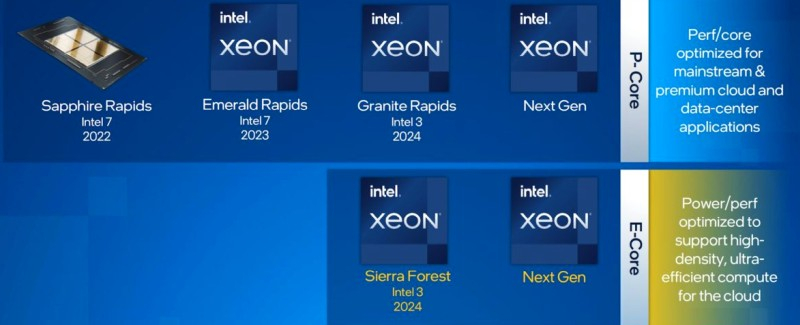 Согласно Intel, Sierra Forest будет использовать процесс изготовления Intel 3, и будет оптимизирован для высокоплотных и «сверхэффективных» вычислений в облачных системах. Недавно Intel подтвердила, что Sierra Forest будет запущен в 2024 году параллельно с производительным Granite Rapids. С их выпуском Intel впервые разведёт процессоры Xeon на две отдельные линейки — с производительными и с энергоэффективными ядрами.
