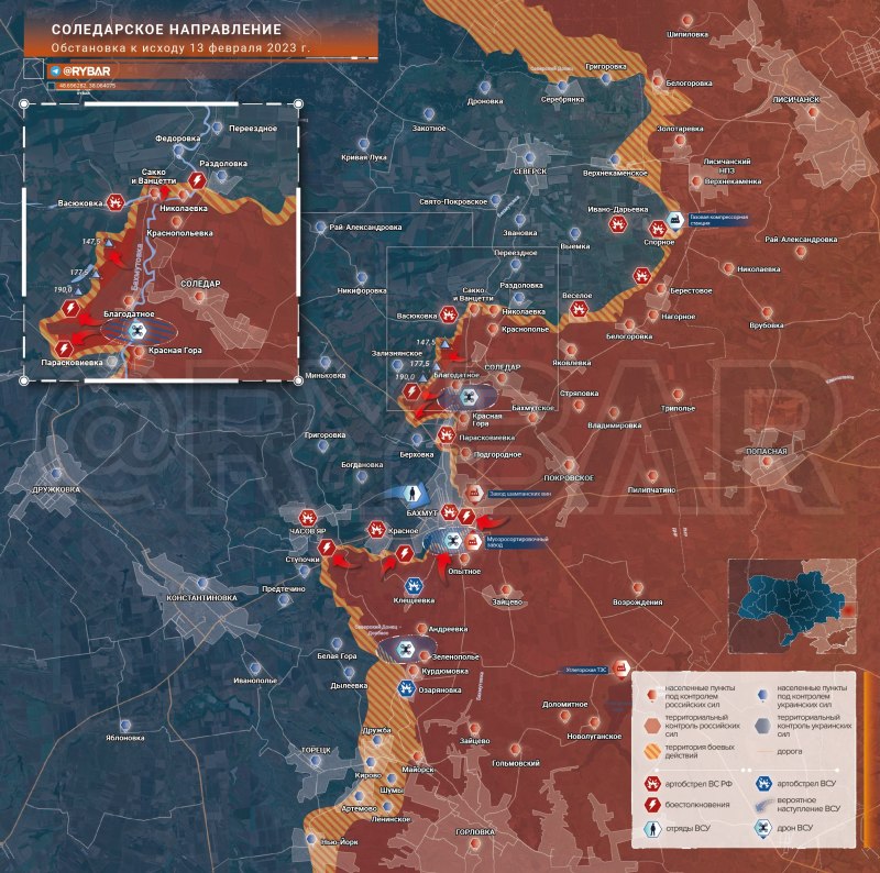 Обстановка на Соледарском направлении к исходу 13 февраля 2023 года