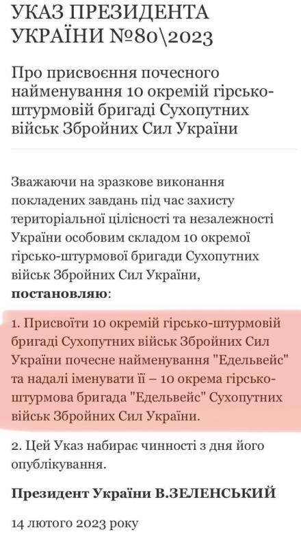 Напомним, глава киевского режима Владимир Зеленский своим указом переименовал 10-ю отдельную горно-штурмовую бригаду ВСУ в «Эдельвейс». Теперь ВСУ стали официальными наследниками одноименной 1-ой горнопехотной дивизии Вермахта Edelweiß, которая в годы Великой Отечественной в составе группы армий «Юг» участвовала в штурме Львова, воевала в Харькове, на Донбассе и творила бесчинства на Северном Кавказе.