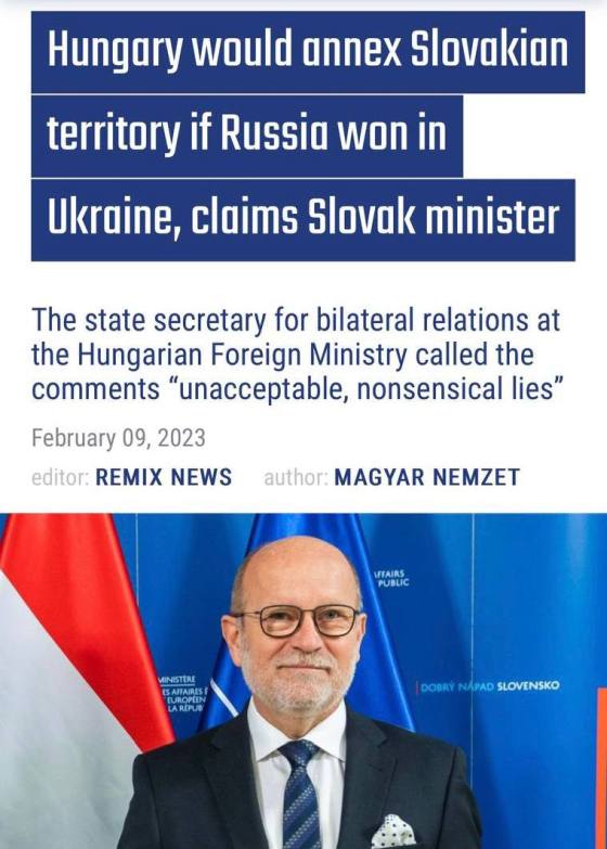 Тем временем глава МИД Словакии Растислава Качера заявил, что в случае победы России на Украине Венгрия аннексирует территорию Словакии. Так, журналисты спросили Качера, угрожает ли Словакия Венгрии и будет ли Венгрия предъявлять территориальные претензии к Словакии, на что он ответил, что считает территориальный спор актуальным уже сейчас, поэтому для Словакии важно, чтобы российские войска не победили на Украине. При этом Качер предложил обратить внимание на шарф премьер-министра Виктора Орбана с изображением Великой Венгрии и подчеркнул, что у него в сейфе есть разведданные об этом инциденте.