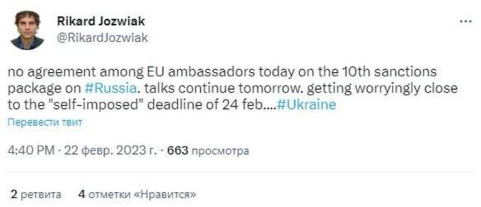 «Сегодня нет согласия между послами ЕС по десятому пакету санкций в отношении РФ. Переговоры будут продолжаться завтра. Тревожно близко приближаются к "установленному ими самими крайнему сроку 24 февраля"», — написал журналист Twitter.