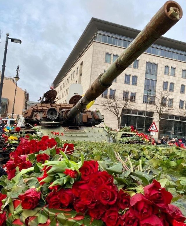 25 февраля в центре Берлина прошла многотысячная демонстрация против поставок оружия Киеву и дальнейшей эскалации конфликта, а также за скорейшее проведение мирных переговоров. Возвращаясь с митинга, многие жители Берлина возлагали на установленный перед посольством РФ в ФРГ подбитый российский танк алые розы.