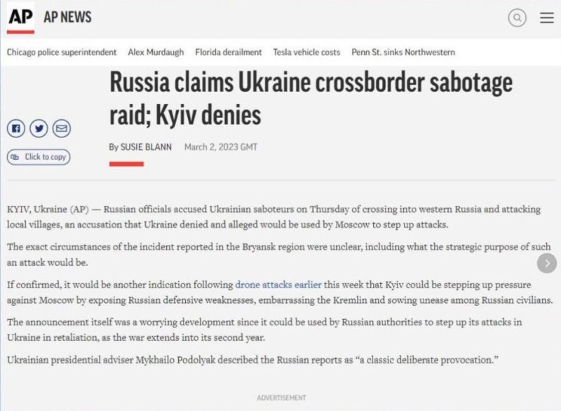 Западные издания, несмотря на то, что ответственность за террористическую атаку на Брянскую область взяло на себя подразделение ВСУ «Русский добровольческий корпус», продвигающее идеи украинского националистического полка «Азов» (признан террористической и экстремистской организацией, запрещён в РФ), поддерживают легенду, что Украина к произошедшему не причастна, и называют теракт «российской провокацией». При этом в публикациях о том, что погиб мужчина, был ранен ребёнок, и были захвачены заложники, ни слова.