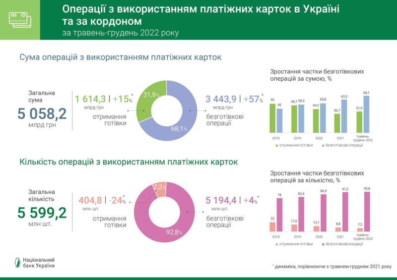По информации НБУ, совокупно на Украине и за границей люди провели в мае-декабря 2022 года 5,2 млрд карточных транзакций на общую сумму 3,4 трлн гривен — это на 4,1% больше по количеству оплат и на 56,9% по сумме в сравнении с аналогичным периодом 2021 года.