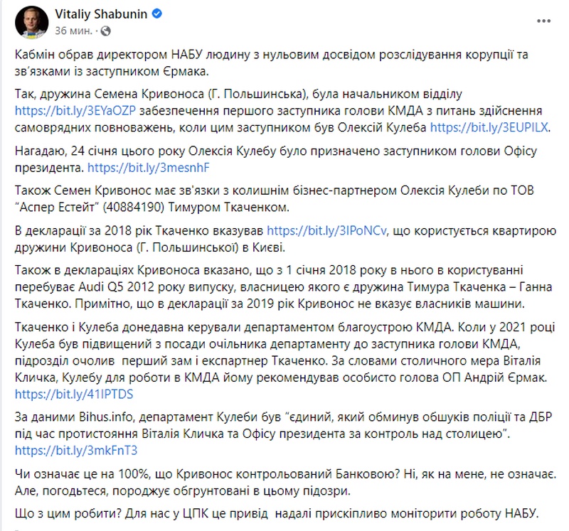 Как подчеркнул председатель правления Центра противодействия коррупции Виталий Шабунин, Семен Кривонос — это человек с нулевым опытом расследования коррупции и связями с заместителем Ермака.