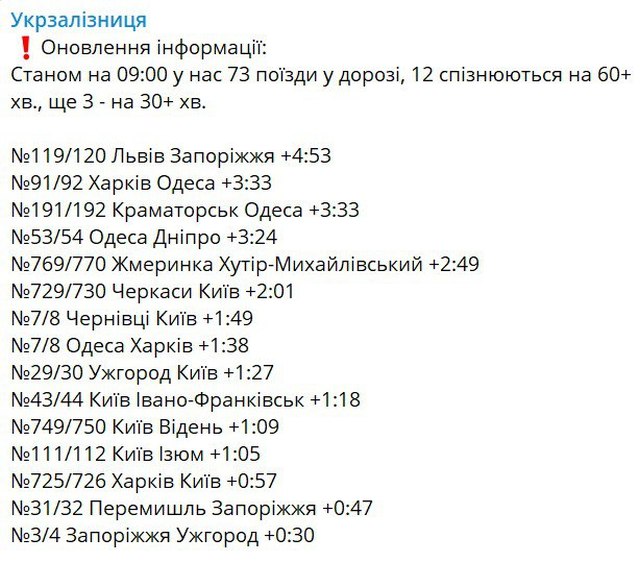 После ударов «Украинские железные дороги» сообщили о задержке поездов до часа из-за проблем с электроснабжением. Несколько поездов задерживаются почти на четыре часа.