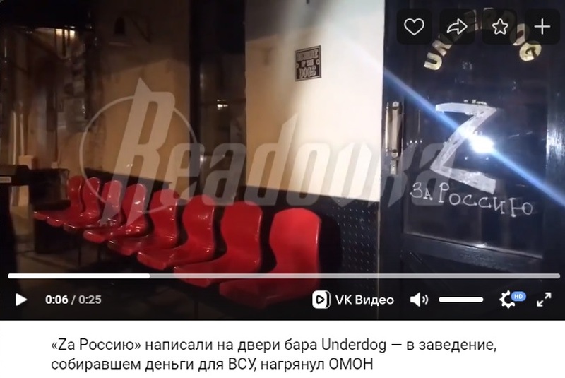 В СМИ сообщают, что сотрудницу бара Underdog полицейские вежливо попросили написать на дверях заведения «За Россию» и нарисовать «Z», а внутри бара включили песни Шамана, «Любэ», «Синий платочек» и «Конь мой вороной», которые спел весь персонал заведения.