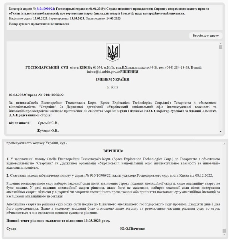 Украинская компания ООО «Старлинк» выиграла суд против американской компании SpaceX, владельцем которой является Илон Маск – Киевский хозяйственный суд отказал SpaceX в удовлетворении иска. Напомним, в октябре 2022 года компания SpaceX подала иск к ООО «Старлинк» и «Укрпатент» с требованием досрочного прекращения действия украинской торговой марки «Старлинк».