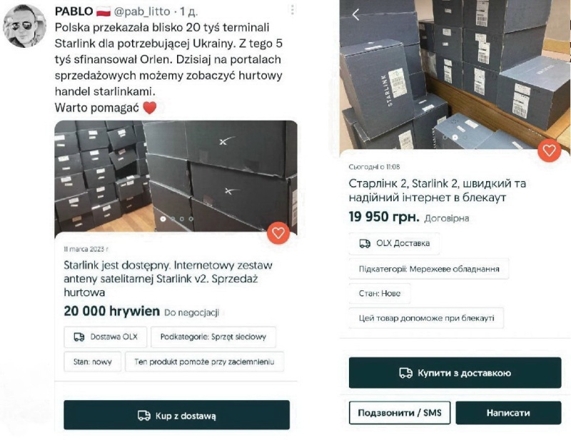 Тем временем пользователи польского твиттера «спалили» украинских патриотов на продаже гумпомощи из Варшавы, Кракова, Жешува и других городов, а именно – терминалов Starlink. Так, один из пользователей заметил на торговых онлайн-площадках коробки, которыми он хвалился у себя на страничке, мол, посмотрите, сколько добра и позитива мы отправим на Украину! Но после увиденного поляк разгневался, написав «hohol, kurwa, ja pierdolę! Jakie bydło jebane».