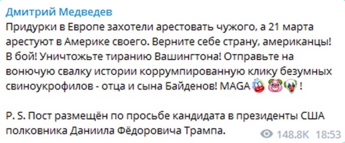 «Придурки в Европе захотели арестовать чужого, а 21 марта арестуют в Америке своего. Верните себе страну, американцы! В бой! Уничтожьте тиранию Вашингтона! Отправьте на вонючую свалку истории коррумпированную клику безумных свиноукрофилов - отца и сына Байденов! MAGA!