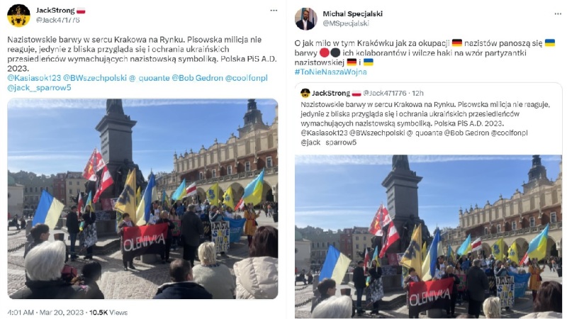 «Нацистские цвета в самом центре Рыночной площади Кракова. Милиция правящей партии не реагирует, только внимательно наблюдает и защищает украинских перемещённых лиц, размахивающих нацистской символикой», — отмечает один из пользователей соцсети.