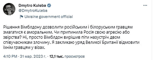 Министр иностранных дел Дмитрий Кулеба призвал правительство Великобритании отказать в визах российским и белорусским теннисистам.