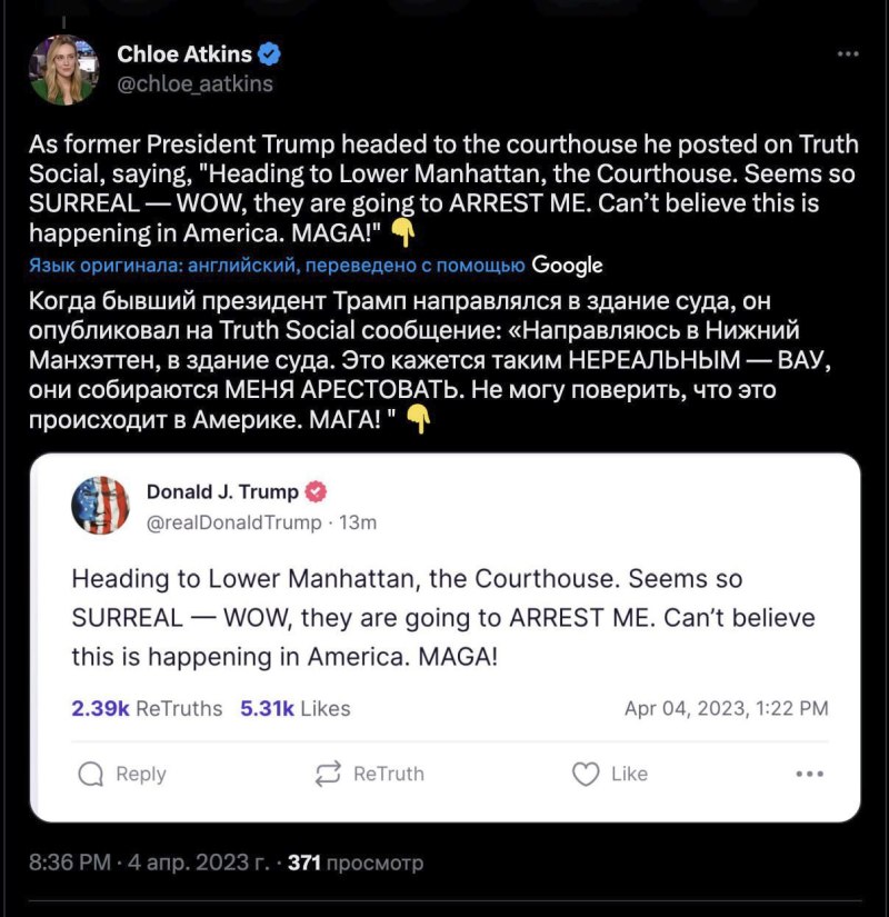 «Не могу поверить, что это происходит в Америке», — отреагировал Трампа на свой арест.