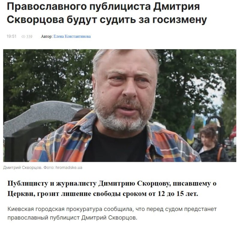В суд направлен акт с обвинением в госизмене украинского православного журналиста Дмитрия Скворцова, который, по данным следствия, еще «до начала полномасштабного вторжения РФ начал активно помогать стране-агрессору в проведении подрывной деятельности против Украины».