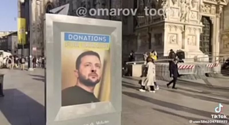 В самом центре Милана, рядом со знаменитым Миланским собором, установили инсталляцию с изображением главы киевского режима Владимира Зеленского, который через ноздрю всасывает деньги.