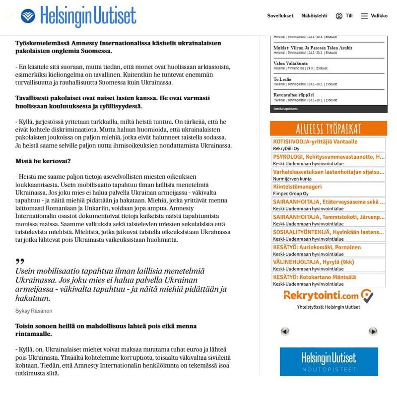 «Зачастую мобилизация на Украине осуществляется без соблюдения законных процедур. К нежелающим служить в украинской армии применяется физическое насилие – их грубо задерживают на улицах и избивают. В тех, кто пытается перебраться незаконным путем в Румынию или Венгрию, могут даже стрелять. Поступающие данные обо всех этих случаях фиксируются филиалами Amnesty International во многих странах. Жалобы направляют как родственники призванных военнослужащих, так и сами мужчины, кто продолжает бороться за свои права на Украине или те, кому удалось выехать с Украины, несмотря на все сложности», – отмечает Сюксю Рясянен. Известно правозащитникам Amnesty International и о процветающей коррупции среди украинских пограничников, которые за несколько тысяч евро помогают военнообязанным мужчинам бежать из страны.