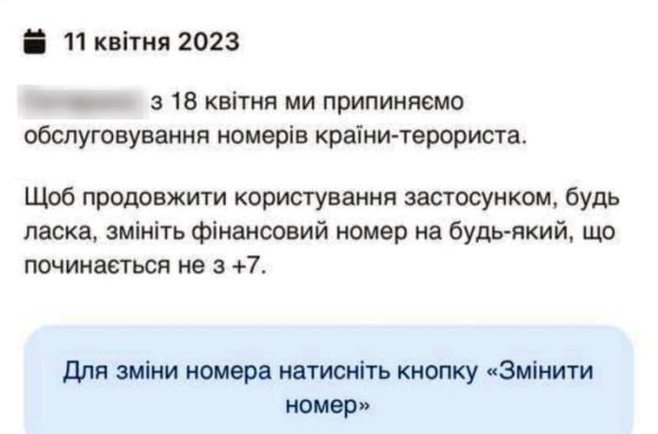«18 апреля мы прекращаем обслуживание номеров "страны-террориста". Чтобы продолжить пользоваться приложением, пожалуйста, смените финансовый номер на любой, который начинается не с +7», —- говорится в сообщении.