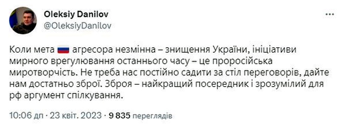 Секретарь Совета национальной безопасности и обороны Алексей Данилов считает, что оружие — «лучший посредник и единственный понятный для России аргумент общения».