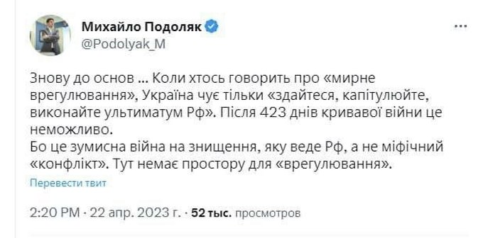 «Когда кто-то говорит о мирном урегулировании, Украина слышит только одно — «сдайтесь, капитулируйте, выполните ультиматум РФ»», — высказался Подоляк.