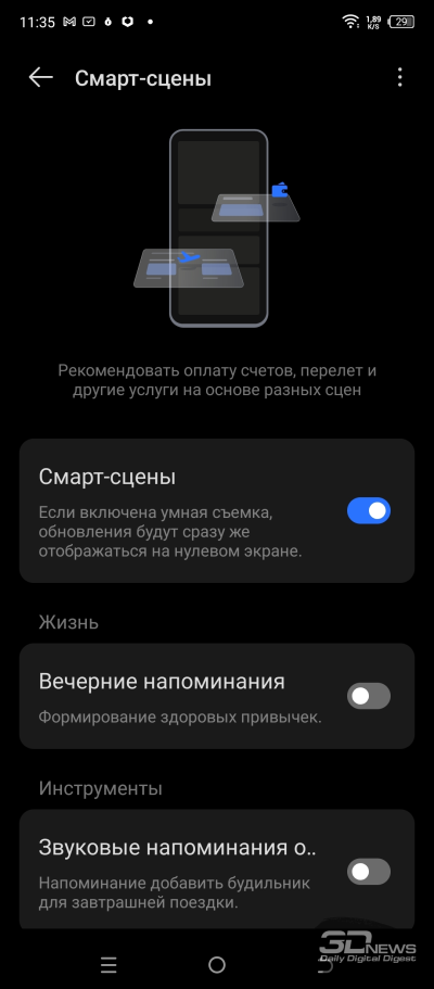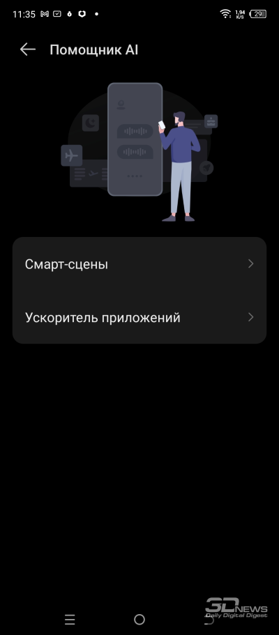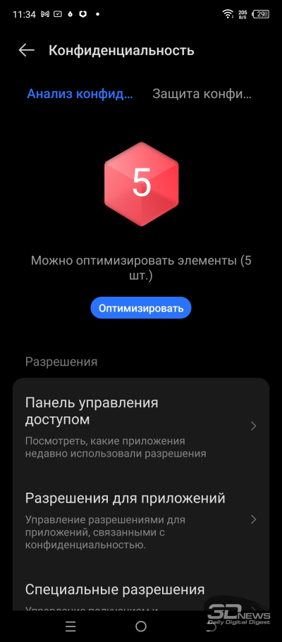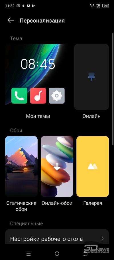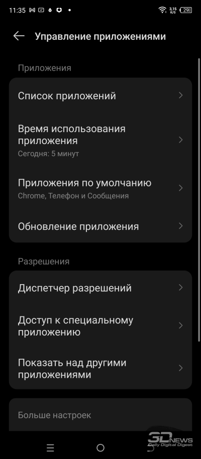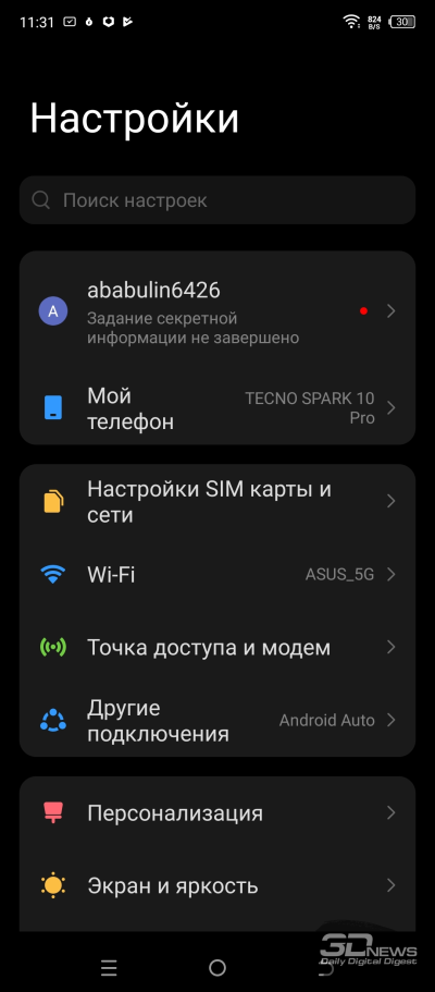 Настроек дисплея немного: яркость (с поддержкой автоматической регулировки); регулировка частоты обновления; режим «защиты зрения» с теплыми цветами, который уместно включать перед сном; режим «В кармане», снижающий чувствительность сенсорного слоя; темная тема, выполняющая на смартфоне с IPS-экраном исключительно декоративную функцию; ну и размер шрифтов. Также можно регулировать цветовую температуру – и это реально имеет смысл сделать, если вы не любите излишне холодные оттенки. Подробнее – в результатах измерений цветопередачи экрана TECNO SPARK 10 Pro.