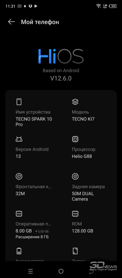 Максимальная измеренная яркость дисплея TECNO SPARK 10 Pro (с приглушенным естественным светом) составила 570 кд/м2. Даже для ЖК-дисплея показатель отличный — на солнце пользоваться смартфоном можно без серьезных проблем. А вот контрастность не то чтобы радует – 1000:1, это ниже, чем у всех конкурентов.