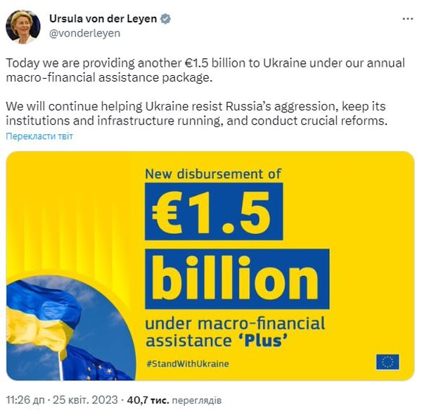 «Сегодня мы предоставляем Украине еще 1,5 млрд евро в рамках нашего ежегодного пакета макрофинансовой помощи. Мы будем продолжать помогать Украине, поддерживать работу ее институтов и инфраструктуры и проводить важные реформы», — написала глава Еврокомиссии в соцсети.