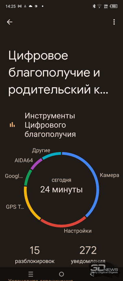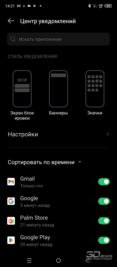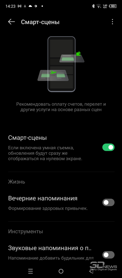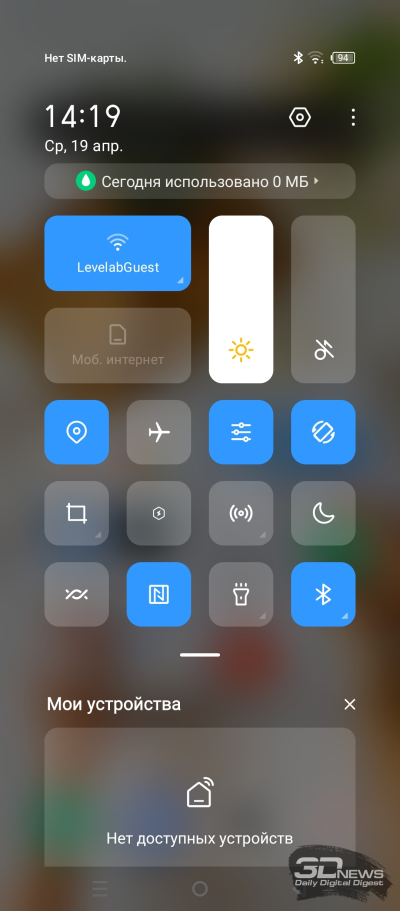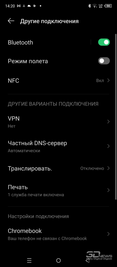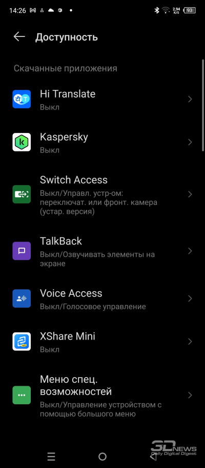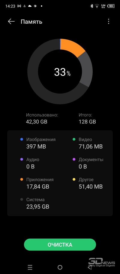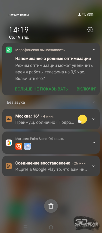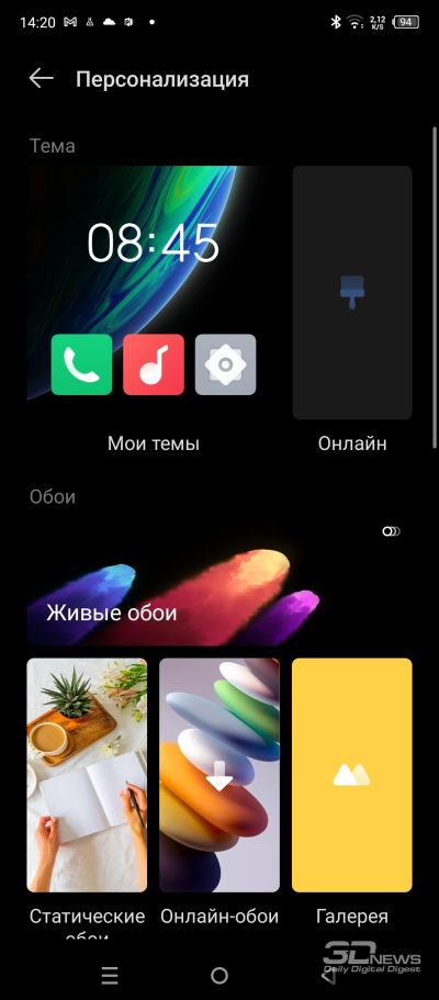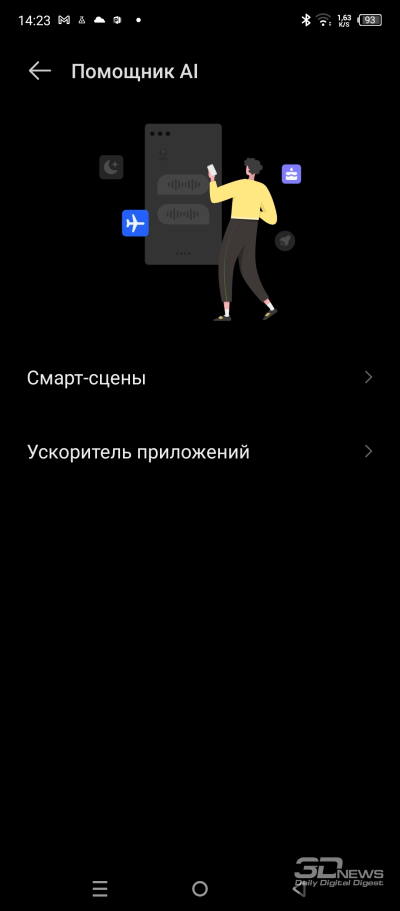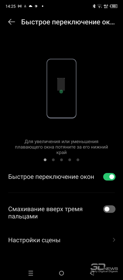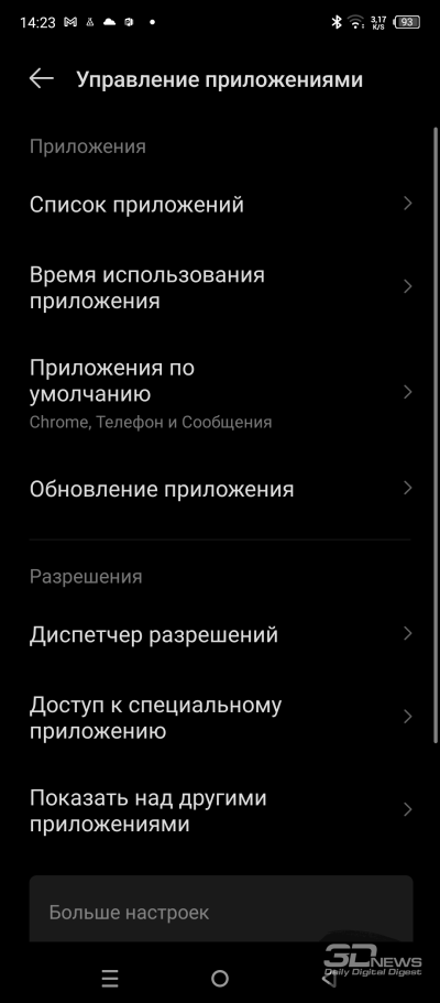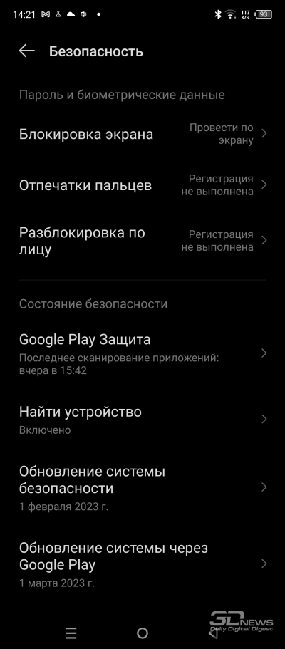 Настроек дисплея немного. Менять дозволено яркость (в том числе включать адаптивную, когда смартфон регулирует ее самостоятельно в зависимости от освещения, — пользоваться ей не рекомендую, лучше сразу выставить на максимум); есть упомянутая уже регулировка частоты, режим «защиты зрения» с теплыми цветами, который уместно включать перед сном. В наличии темная тема, которая несет на смартфоне с ЖК-экраном декоративную функцию, и возможность подстраивать размер шрифтов. Есть и режим «В кармане», в котором снижается чувствительность сенсорного слоя дисплея во избежание случайных действий с ним. Предустановок цветопередачи нет, но можно вручную регулировать цветовую температуру.