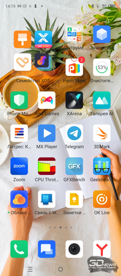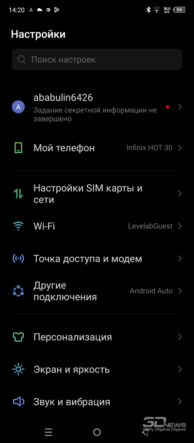 Infinix HOT 30 работает под управлением Android 13 с оболочкой XOS 12.6. Про свежую версию оболочки Infinix я уже несколько раз рассказывал, подробнее всего — в обзоре Infinix ZERO 20. Дизайн все еще специфический, с акцентом на крупных папках и большим количеством предустановленных приложений, местами встречается реклама. Но работает система быстро, функциональность на уровне, а русификация постепенно доводится до нормального уровня (хотя шероховатости по-прежнему имеются).