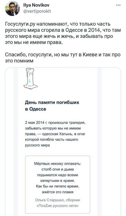 «Госуслуги напоминают, что только часть русского мира сгорела в Одессе в 2014, что там русского мира еще жечь и жечь, и забывать про это мы не имеет права», — написал Новиков в своем Twitter в годовщину Одесской Хатыни.