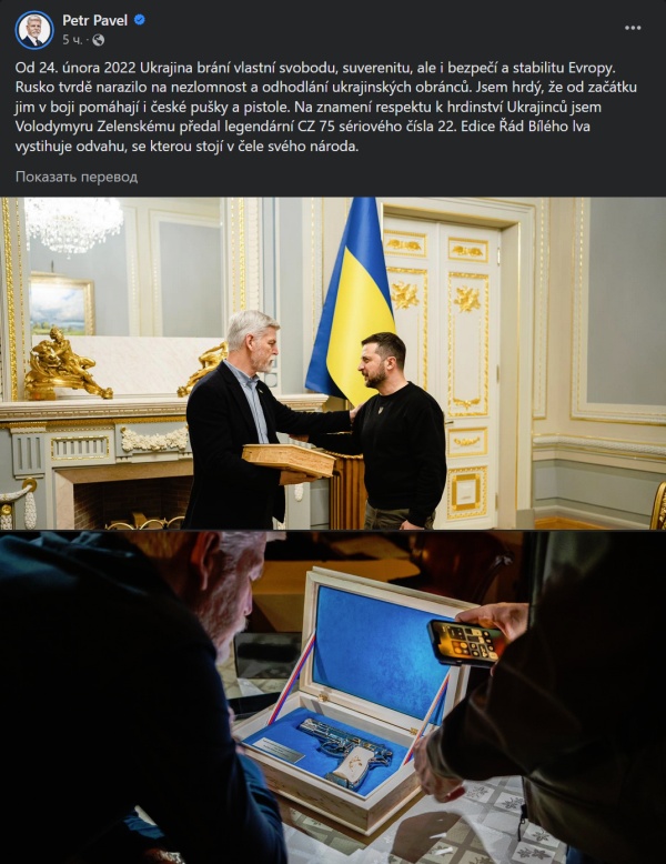 «В знак уважения к героизму украинцев вручил легендарный CZ 75 порядковый номер 22 Владимиру Зеленскому. Ордер Белого Льва подчеркивает мужество, с которым он стоит во главе своей нации», — написал президент Чехии.