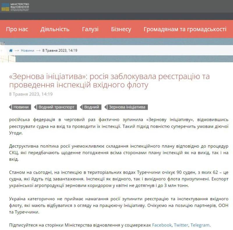Украина обвиняет РФ в блокировании регистрации и проведения инспекций входящих в Чёрное море суден, участвующих в «зерновой сделке». Якобы, по состоянию на сегодняшний день, инспекцию в территориальных водах Турции ожидает 90 судов, из которых 62 — это суда, идущие под загрузку.