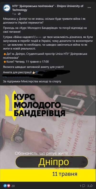 Инициативу украинского правительства реализуют в НТУ «Днепровская политехника»: «Живешь в Днепре и не знаешь, сколько будет длиться война и как помочь Украине победить? Приходи на «Курс Молодого Бандеровца» и услышь ответы на свои вопросы!», – сообщают на сайте учебного заведения.