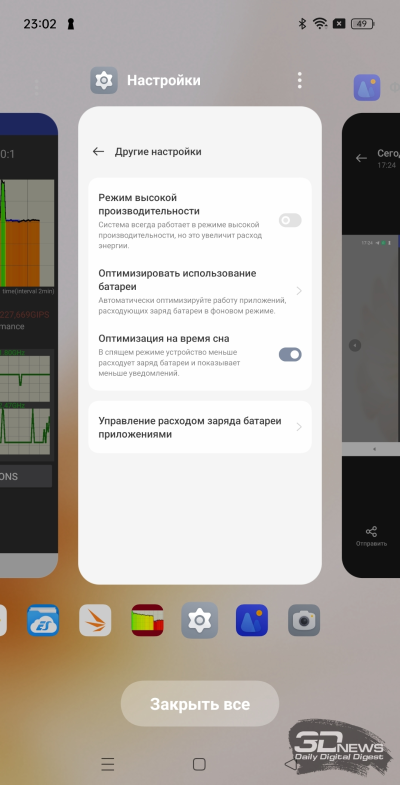 Высокая частота обновления на смартфонах OPPO устанавливается только на постоянной основе, автоматической регулировки, когда смартфон сам решает, где нужно выставить 120 герц, а где можно ограничиться и шестьюдесятью, нет. Но в определенных приложениях смартфон все же снижает частоту — например, как это часто бывает, в играх. Увы.