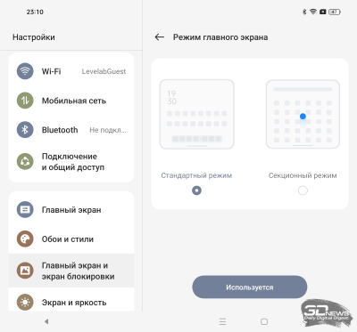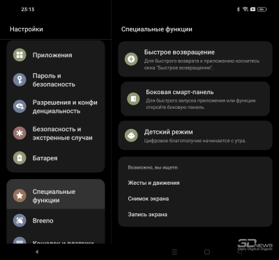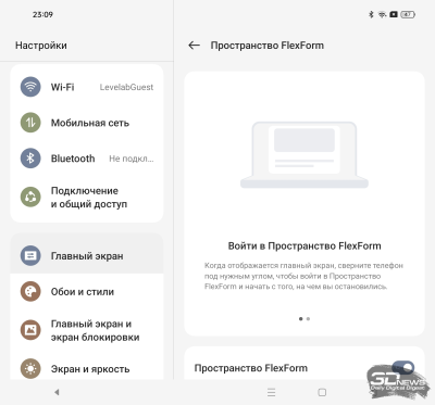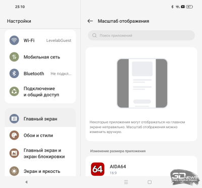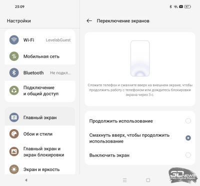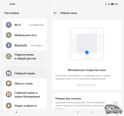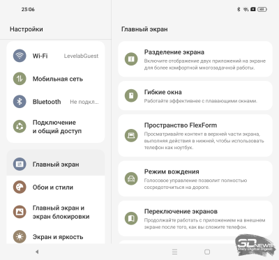 То, что он иначе выглядит на внутреннем экране смартфона, как раз более чем нормально. Интерфейс, скажем так, «планшетизирован»: расширенная панель быстрого доступа, раздвоенный экран настроек, обилие функций по параллельному запуску нескольких приложений (как бок о бок, так и в режиме «картинка в картинке»), несколько дополнительных панелей быстрого доступа — одна заменяет крайний левый экран Google Now, другая предлагает приложения для быстрого запуска поверх рабочего стола. Но есть некоторая проблема: приложения не всегда корректно масштабируются при переключении между экранами, оставляя большие поля и не растягиваясь на весь экран — для масштабирования их необходимо перезагружать.