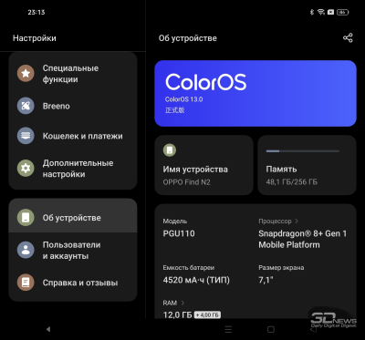 Внутренний экран тоже относительно небольшой — 7,1 дюйма. Иные смартфоны традиционного форм-фактора по диагонали приближаются к OPPO Find N2 – хотя, конечно, это иллюзия: почти квадратный экран намного больше по площади при близкой диагонали. Но всерьез говорить о «планшетном» опыте не стоит, это устройство меньших габаритов. Логично, что и весь смартфон получился относительно компактным. Это, конечно, не относится к толщине (7,4 мм в разложенном виде), но зато полностью относится к массе — 233/237 граммов, это самый легкий трансформер такого форм-фактора. Легче только раскладушки.