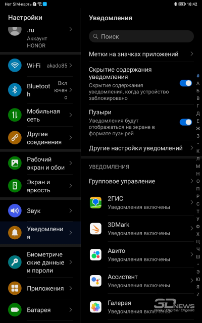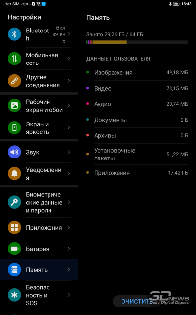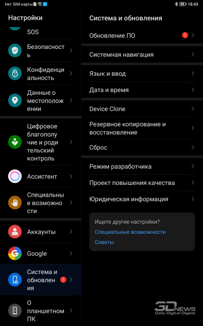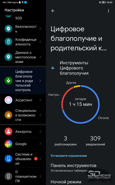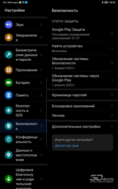 В настройках экрана можно активировать защиту зрения (режим с максимально теплыми цветами), темный режим интерфейса, выставить так называемое умное разрешение (что имеется в данном случае, понять не вышло – заметить, где планшет переключает разрешение со своего стандартного Full HD+, я не смог), а также изменить цветовую температуру.