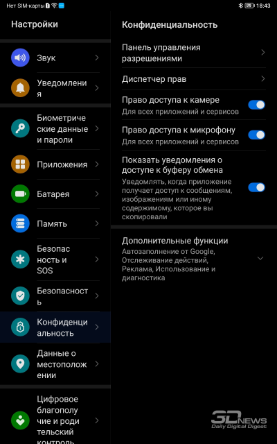 Сканера отпечатков в планшете нет. Можно либо «запаролить» устройство по классике, либо установить систему разблокировки при помощи распознавания лица — для этого используется фронтальная камера.