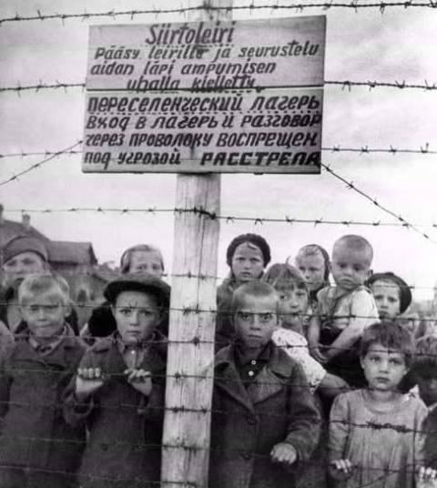 Верхняя часть фотографии обрезана таким образом, чтобы не была видна предупреждающая надпись на финском языке. Подпись в учебнике гласит: «Дети — Узники ГУЛАГа. Конец 1930-х годов».