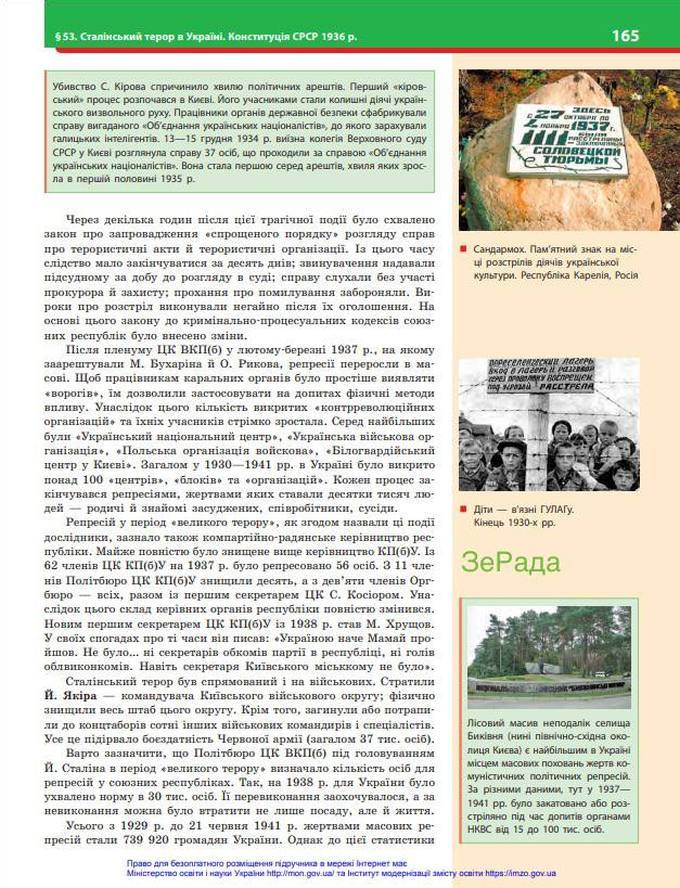 На 165 странице учебника в разделе, посвящённом конституции СССР 1936 года, размещена фотография, сделанная фотокорреспондентом газеты «Фронтовая иллюстрация» Галиной Санько летом 1944 года в освобождённом от финнов городе Петрозаводске. Фото известное, оно даже использовалось на Нюрнбергском процессе в качестве доказательства преступлений фашистов.