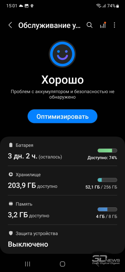 В играх (как минимум в Call of Duty Mobile, Genshin Impact и Alto-s Adventure) повышенная частота не поддерживается – это тоже уже стало общим местом, причем не только для относительно недорогих аппаратов с экранами с повышенной частотой, но и для иных флагманов. В остальном это вполне стандартный смартфонный дисплей для нашего времени: полноценный «сэндвич» с поляризационным слоем и нормальным олеофобным покрытием, со свободными углами обзора. Характерная для Samsung ШИМ тоже на месте — при низкой яркости экран заметно мерцает, а специального режима, снижающего этого эффект, нет.