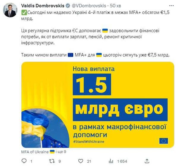 Евросоюз выделил Украине четвертый транш на сумму в 1,5 миллиарда евро в рамках макрофинансовой помощи (MFA). Об этом сообщил вице-президент Еврокомиссии Валдис Домбровскис в соцсетях.