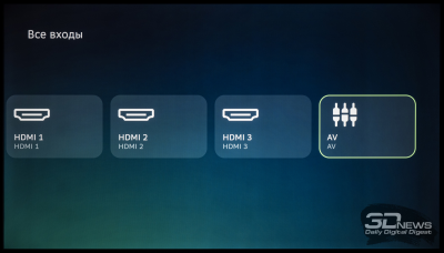 | Видеовходы | 3 × HDMI 2.0; 1 × AV-In — аналоговый аудиовидеовход; 1 × CI+ — слот для CAM-модуля; 1 × SAT — подключение спутникового ТВ; 1 × RF — антенный вход |