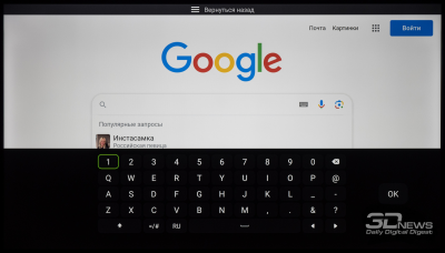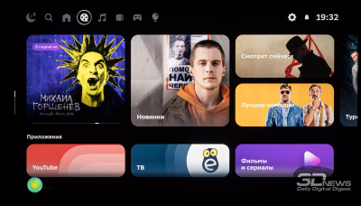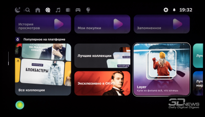 Три клавиши под «кольцом навигации» позволяют быстро перейти на домашний экран (а при долгом нажатии — вызвать настройки телевизора в любом из приложений, в том числе при подключении к ПК через HDMI), активировать голосовой помощник «Салют» или перейти к предыдущему экрану. Четыре нижние клавиши задействованы для быстрого запуска сервисов Okko, «Кинопоиск», Wink и Rutube.